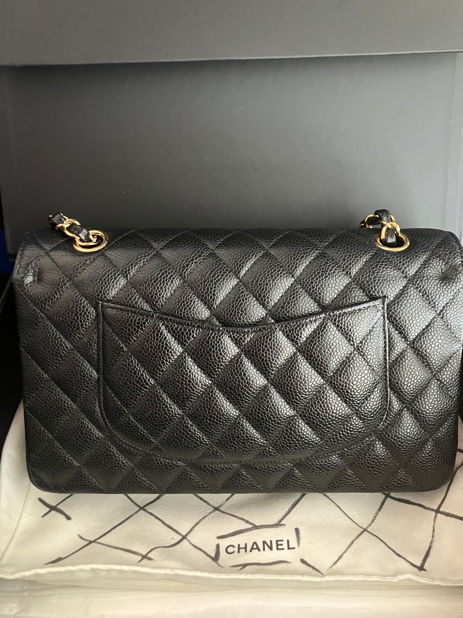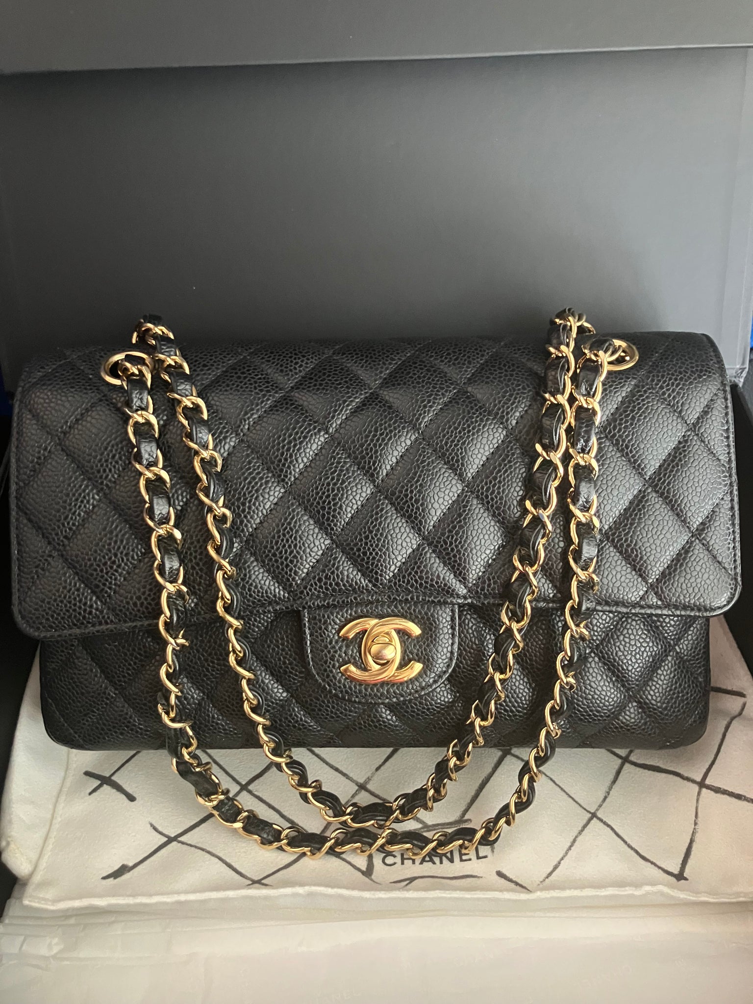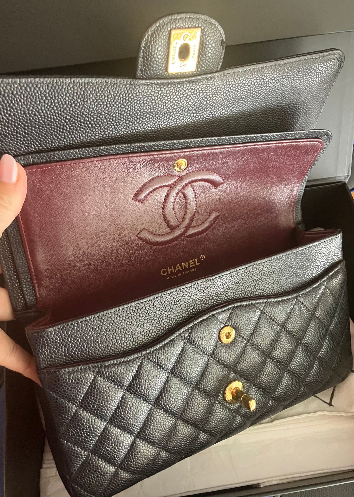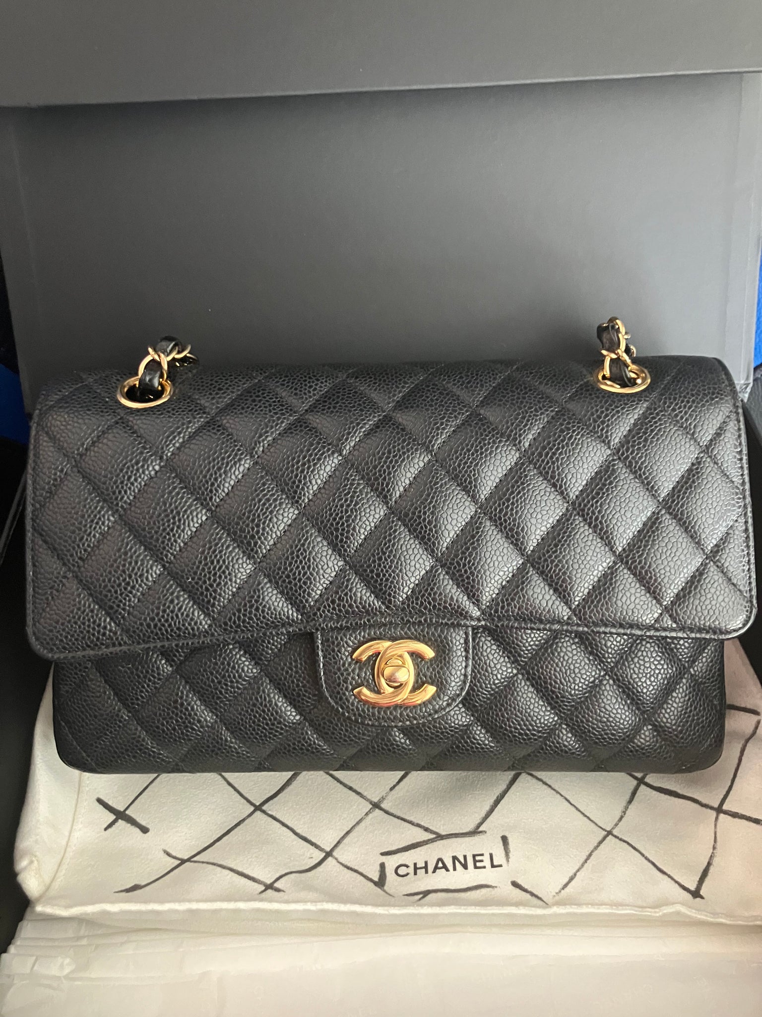 Chanel black caviar medium classic flap, gold hdw. Comes with box, dustbag, authenticity card and entrupy certificate. 21 series from 2016