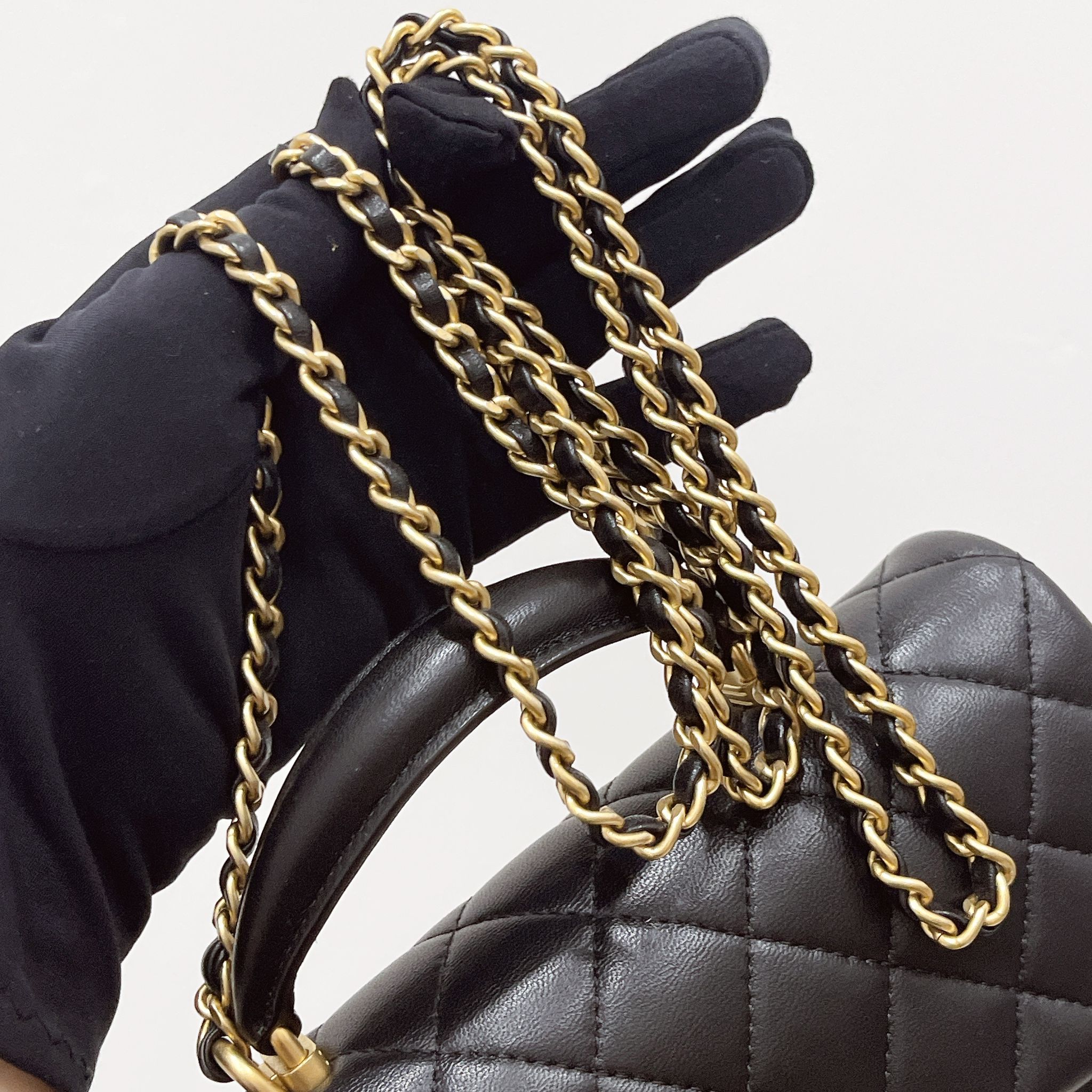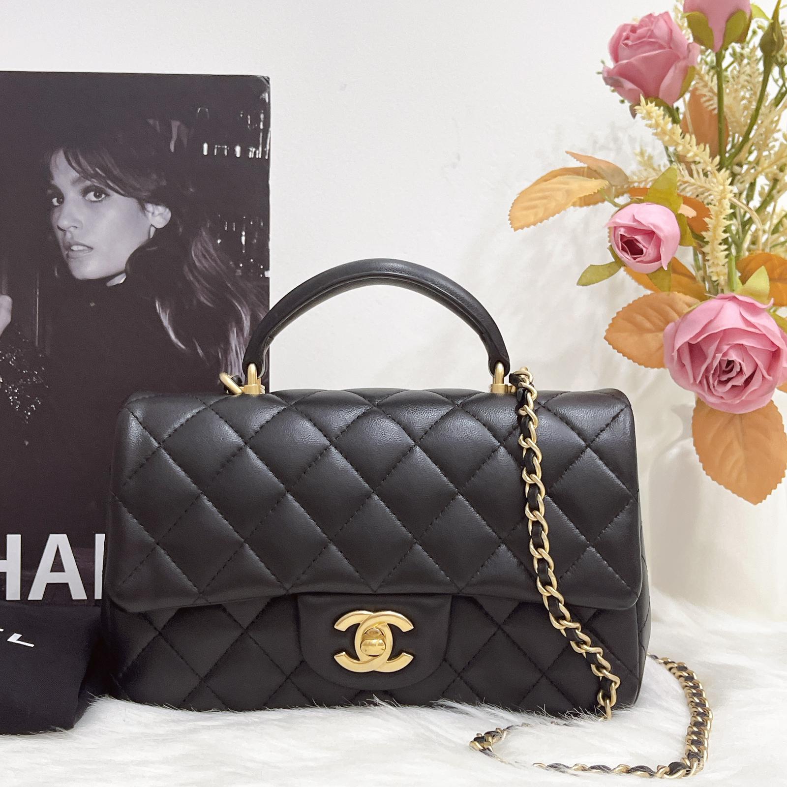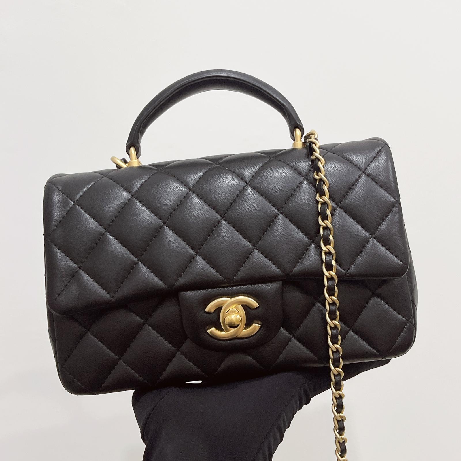 Chanel black mini lambskin, 20cm with top handle and gold hdw. Comes with box, dust bag, chip and entrupy certificate