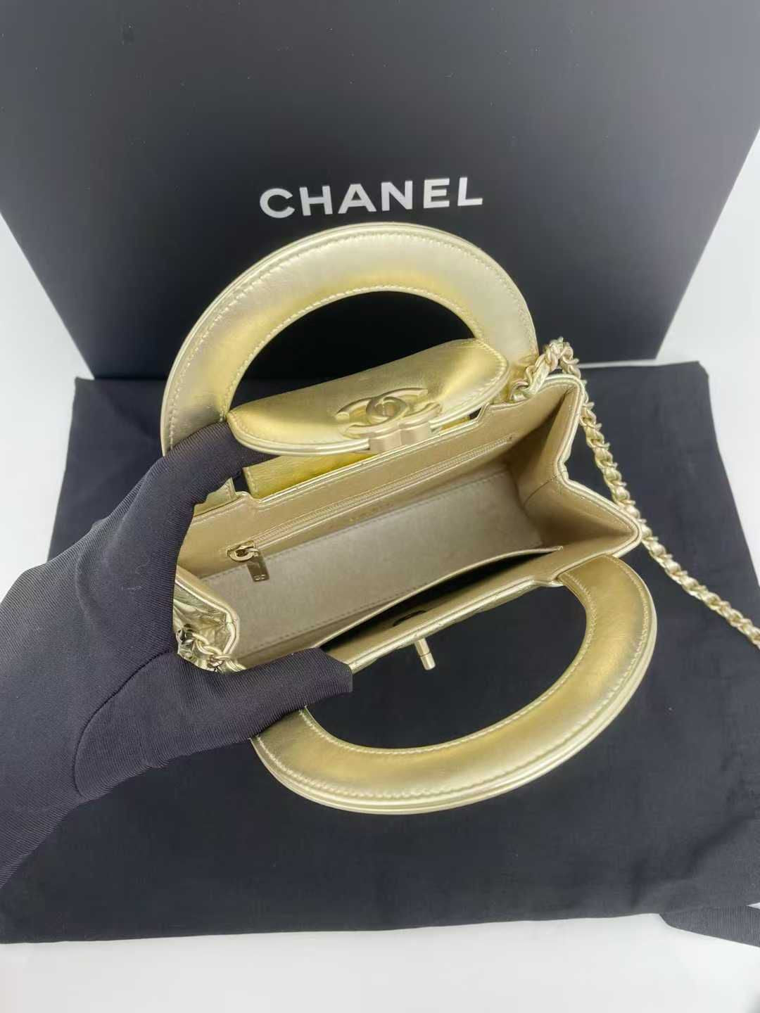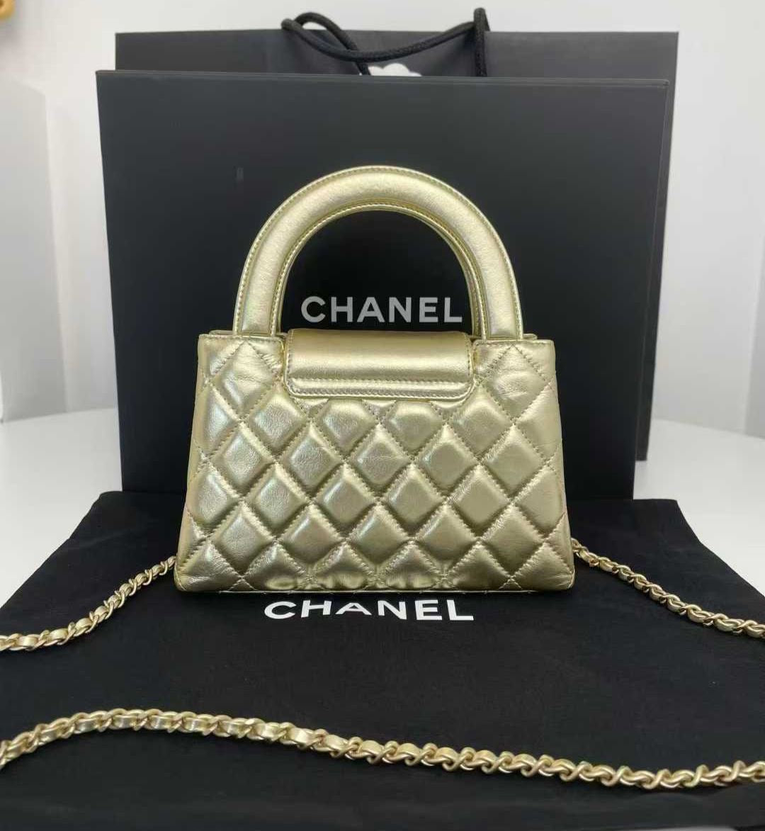 Chanel gold Kelly shopper nano (larger size) in shiny gold calfskin, gold hdw. Very hard to get! Full set with box, dustbag, chip and entrupy certificate of authenticity