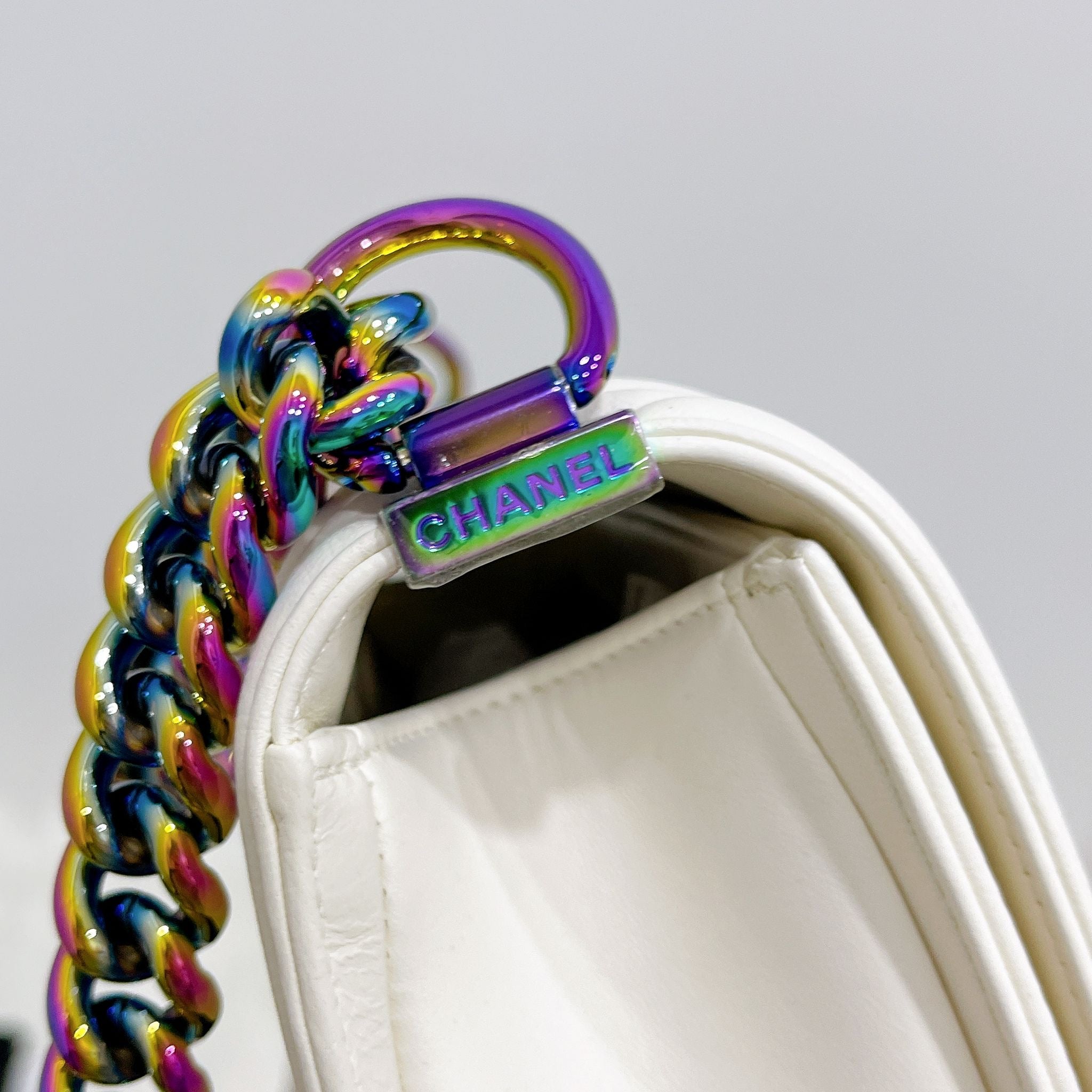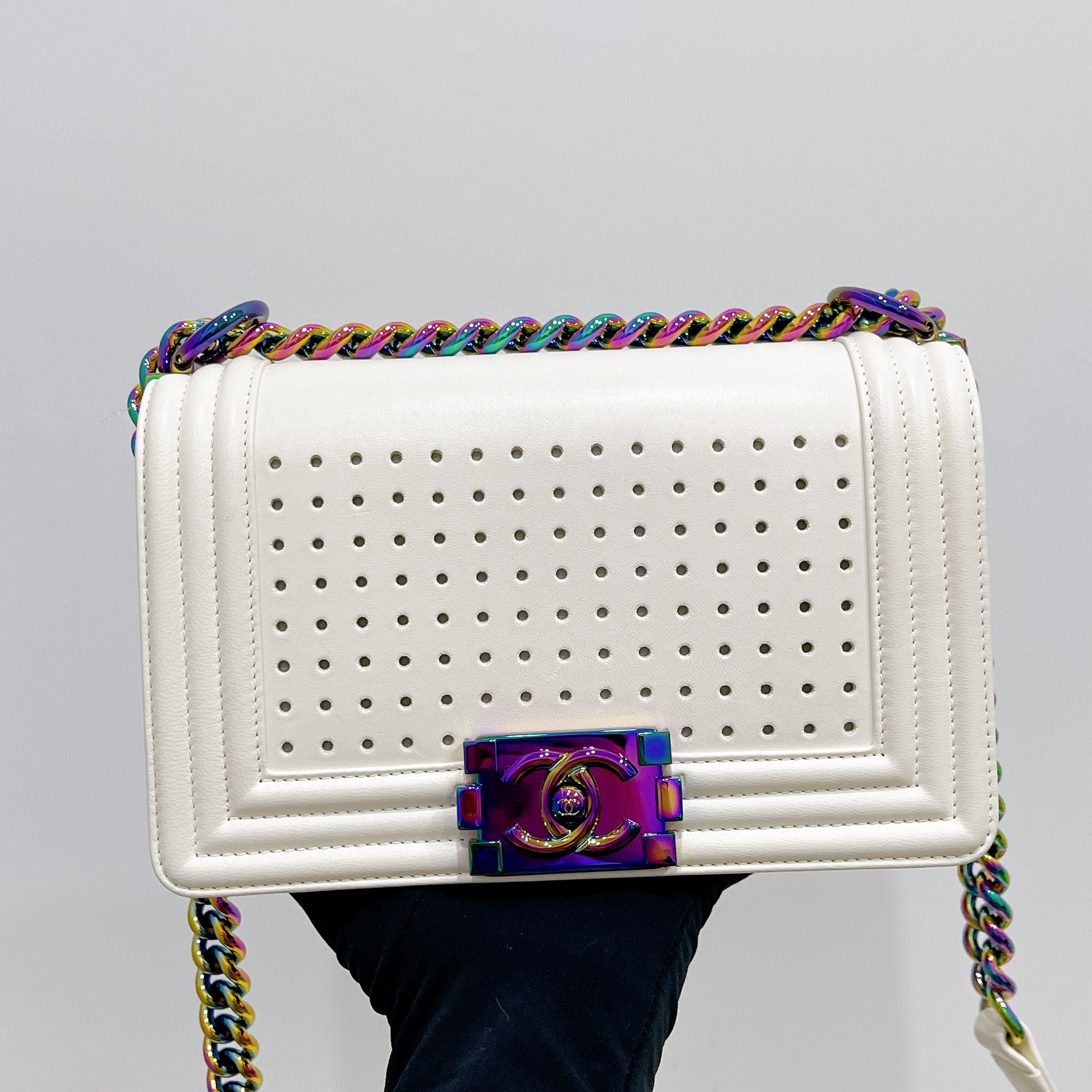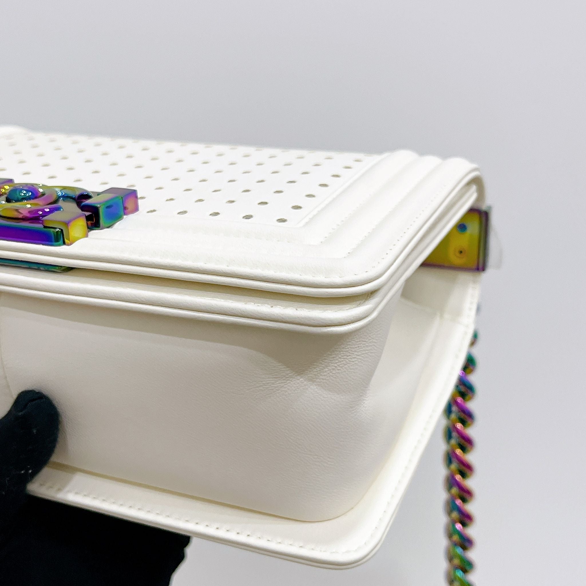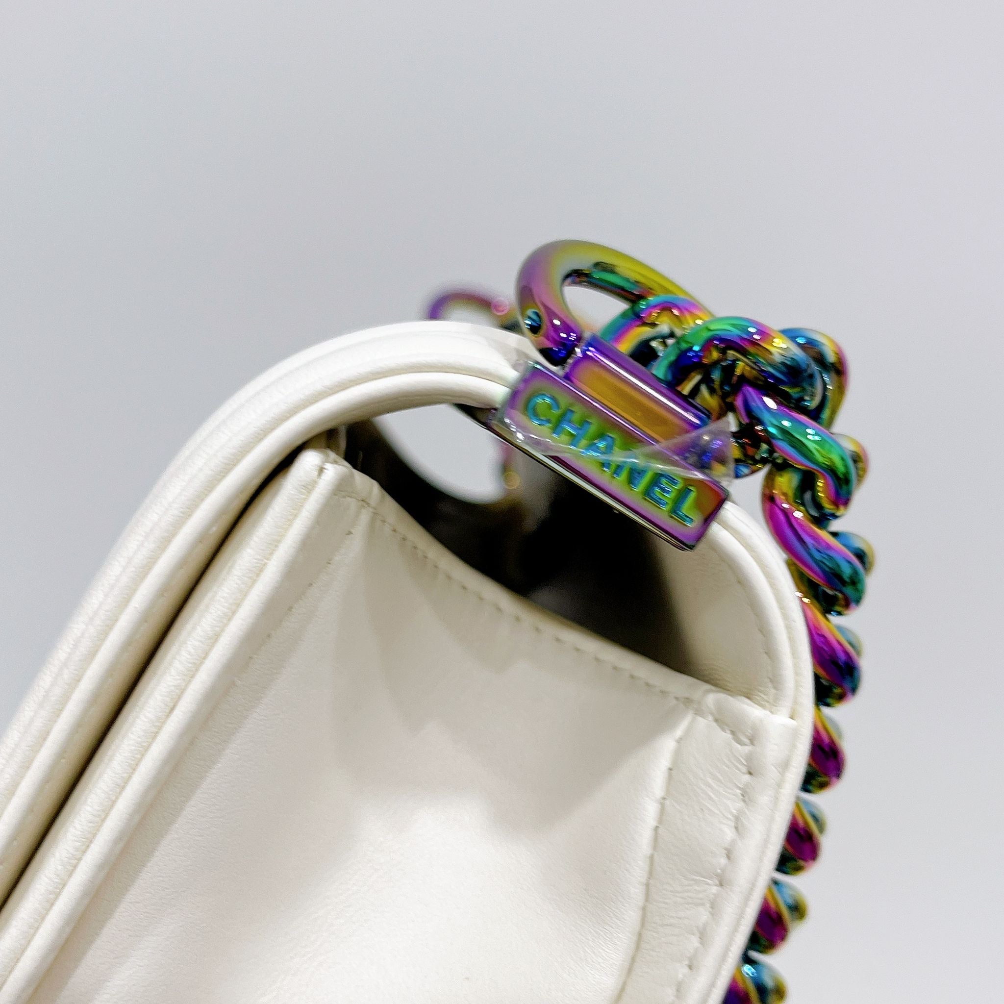 Chanel rare LED white medium boy bag with rainbow iridescent hdw. 24 series. Comes with box, dustbag, authenticity card and secondary authentication certificate.