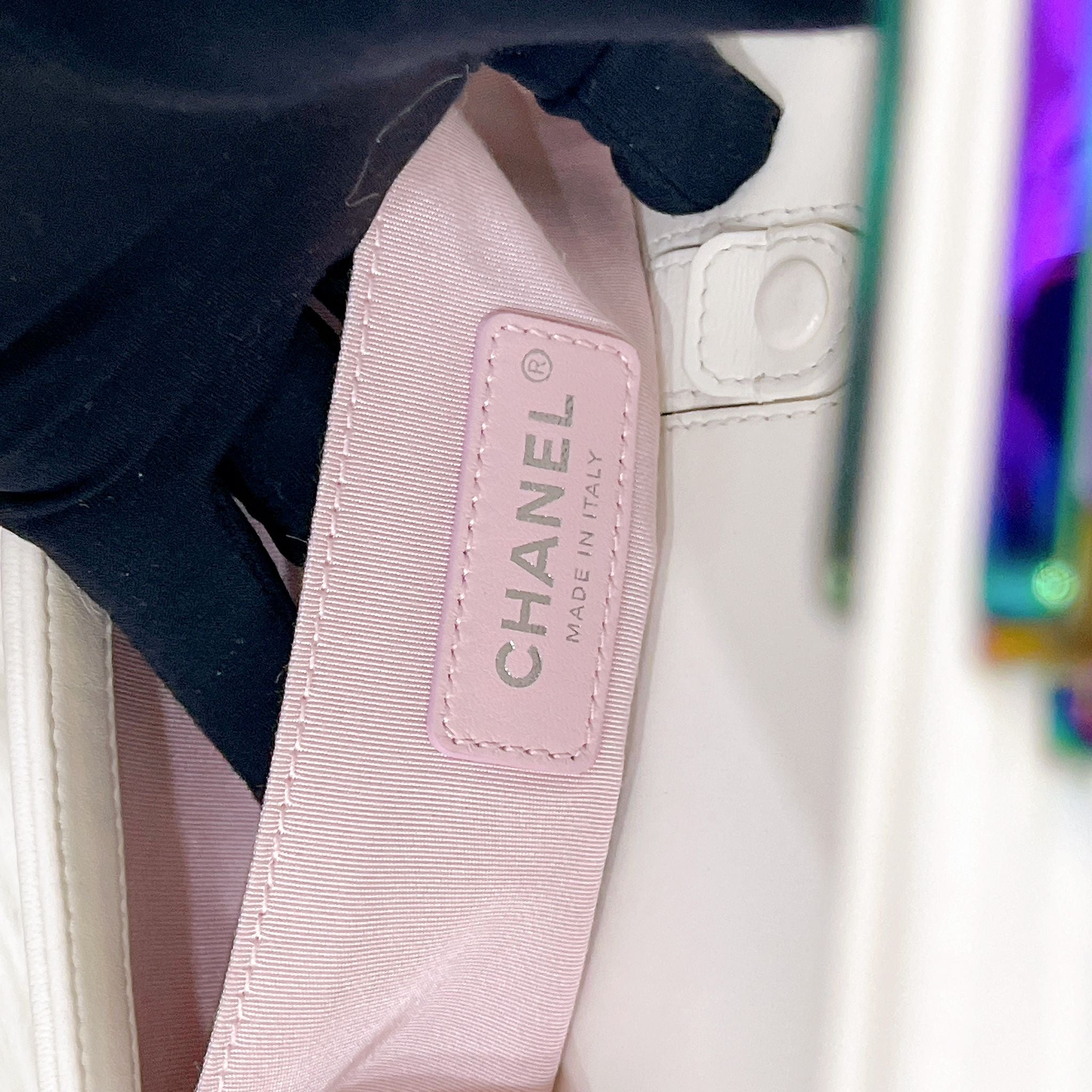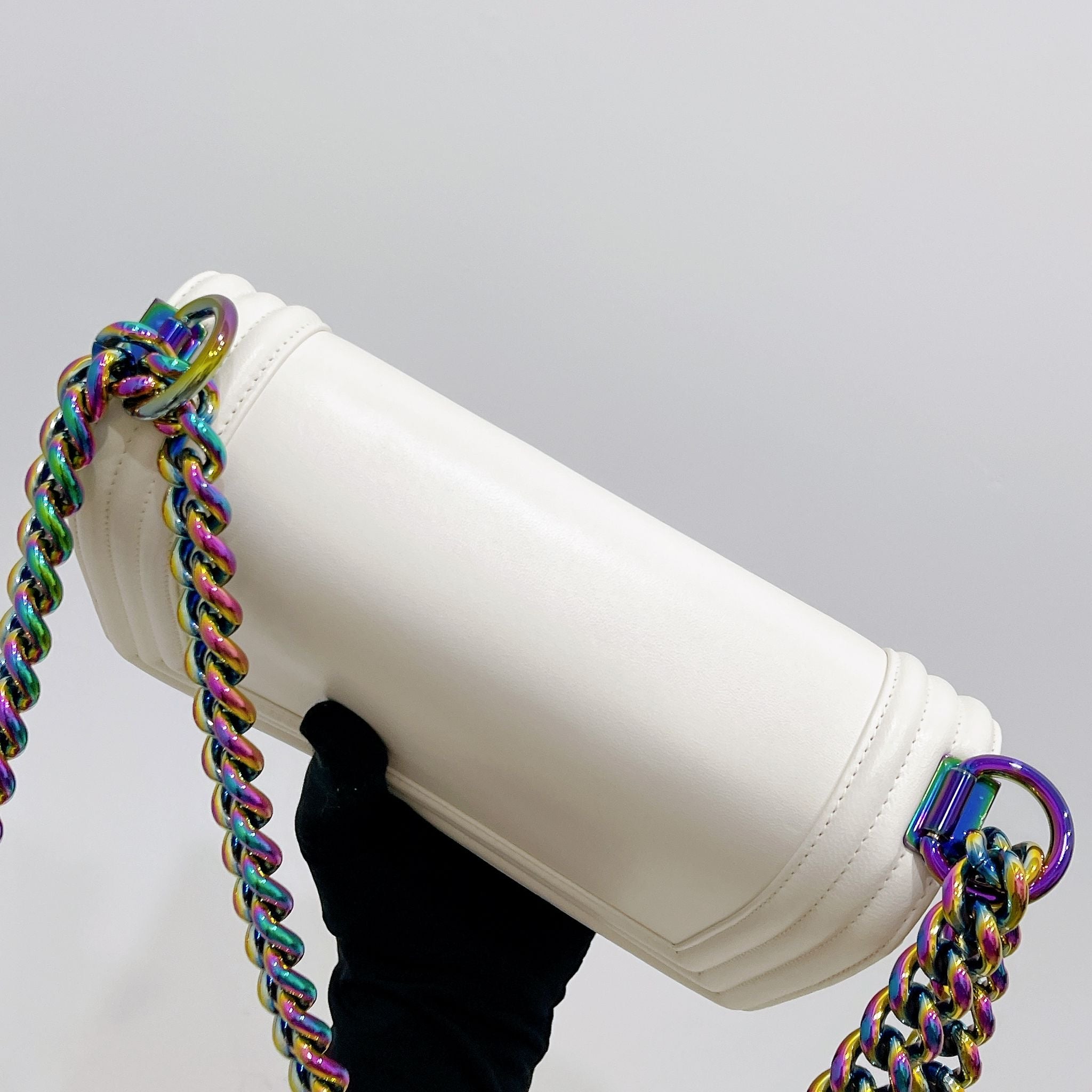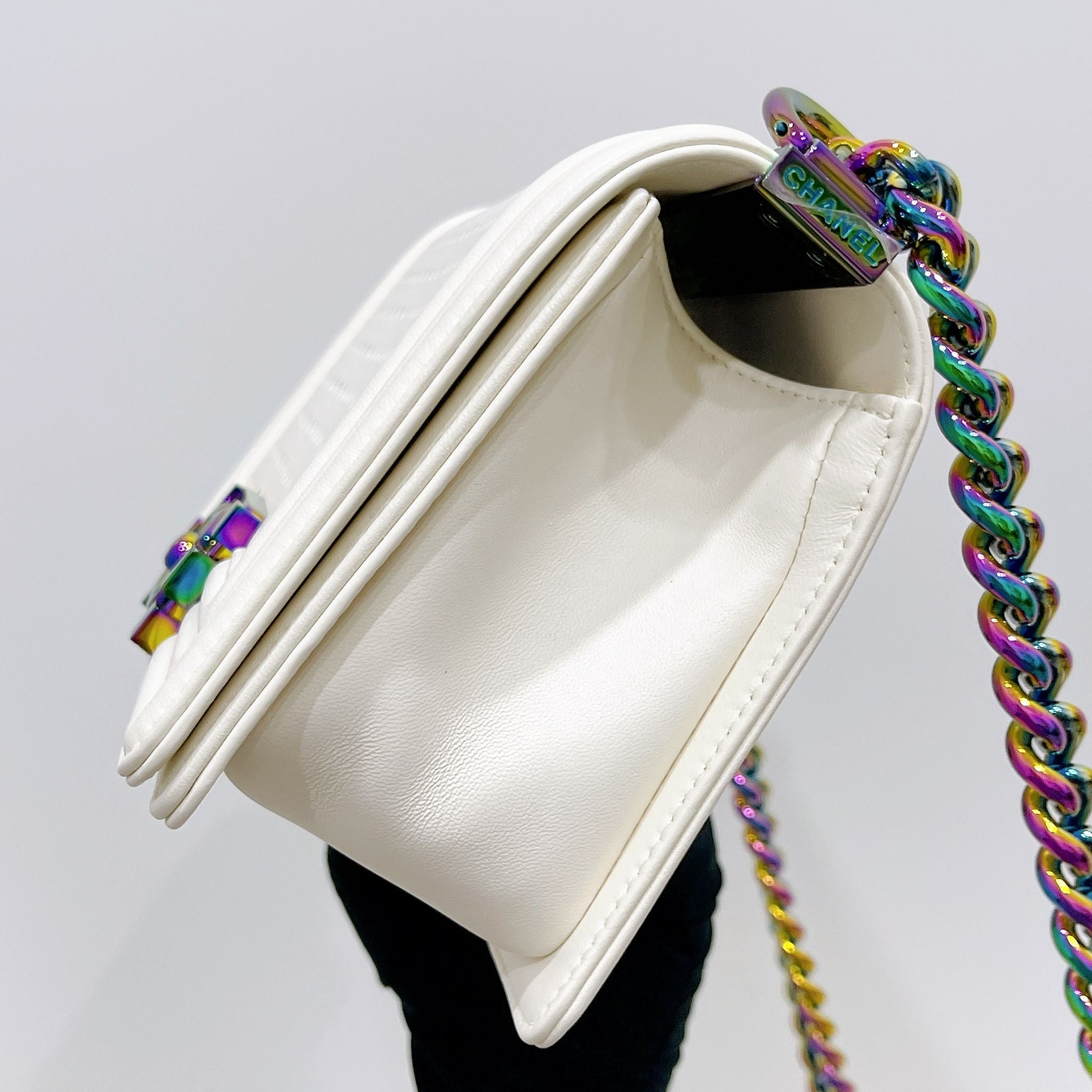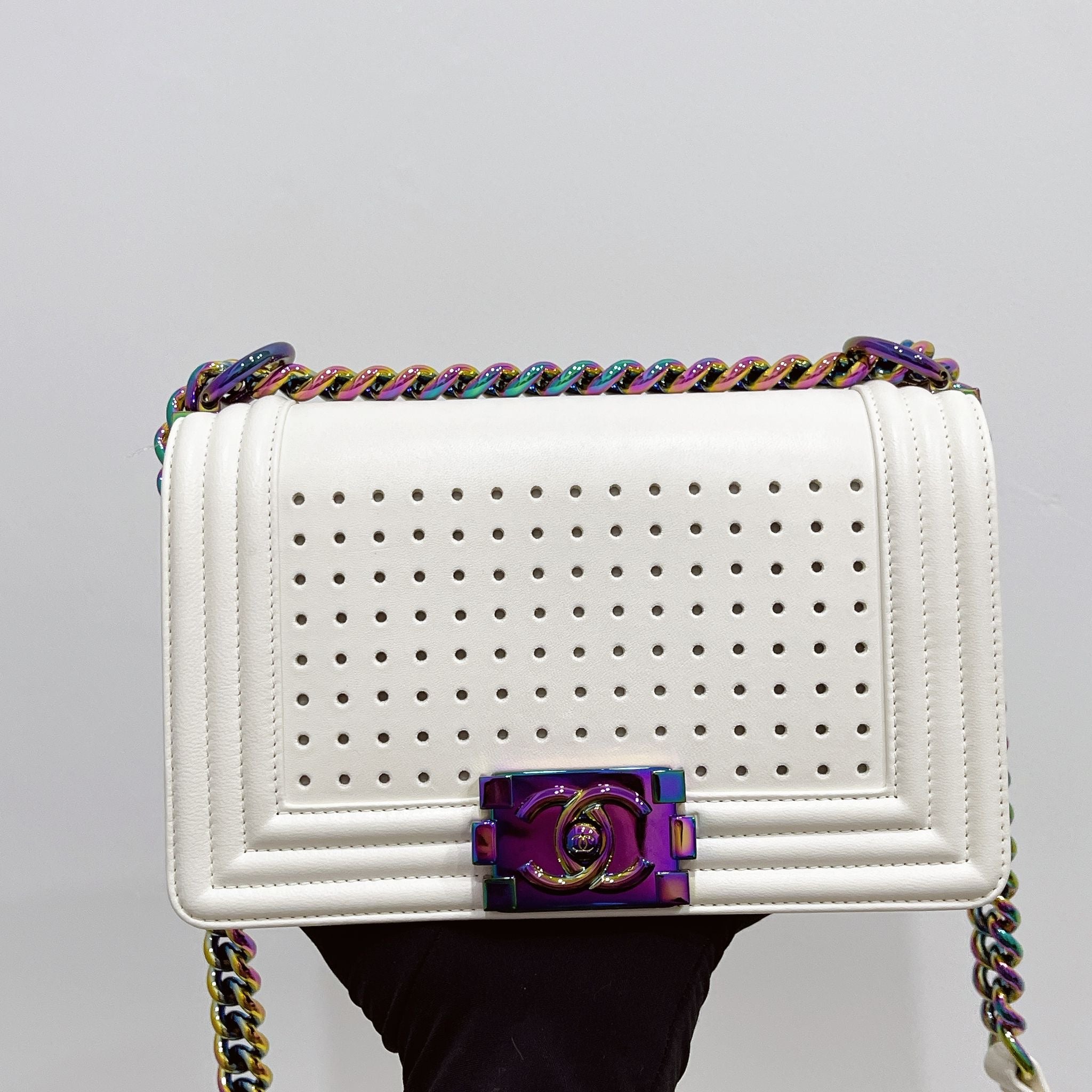 Chanel rare LED white medium boy bag with rainbow iridescent hdw. 24 series. Comes with box, dustbag, authenticity card and secondary authentication certificate.