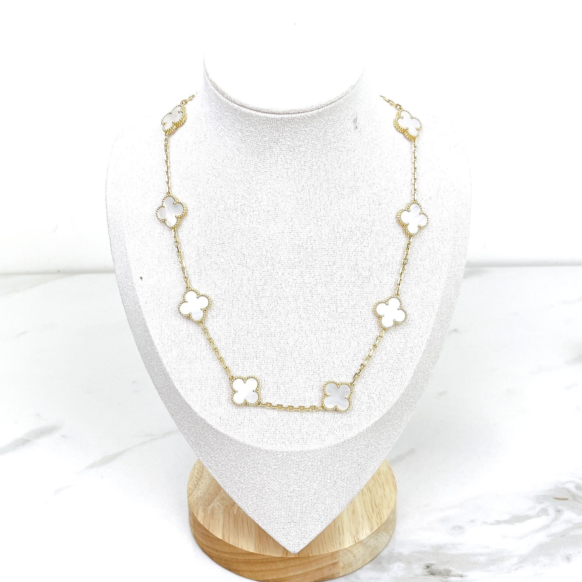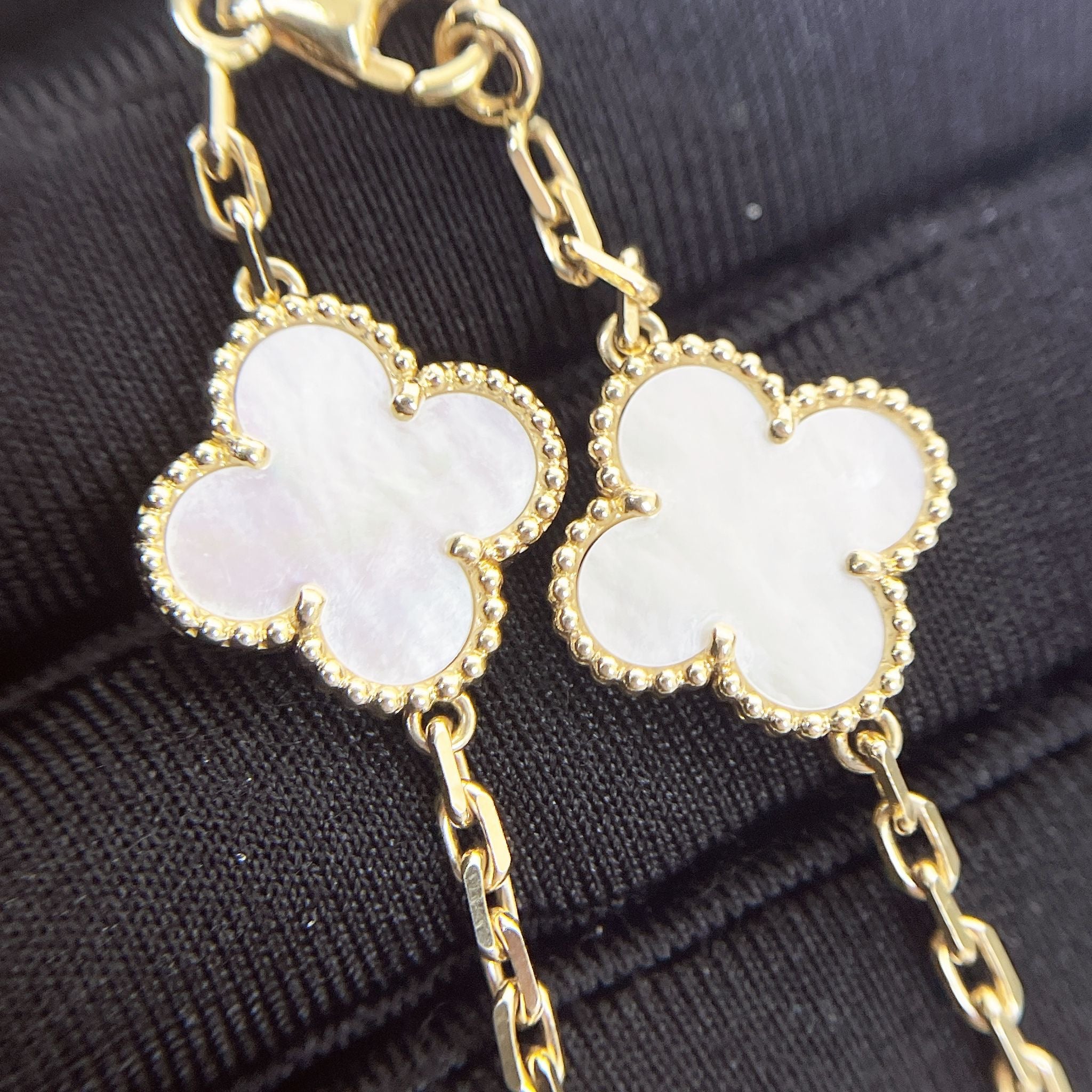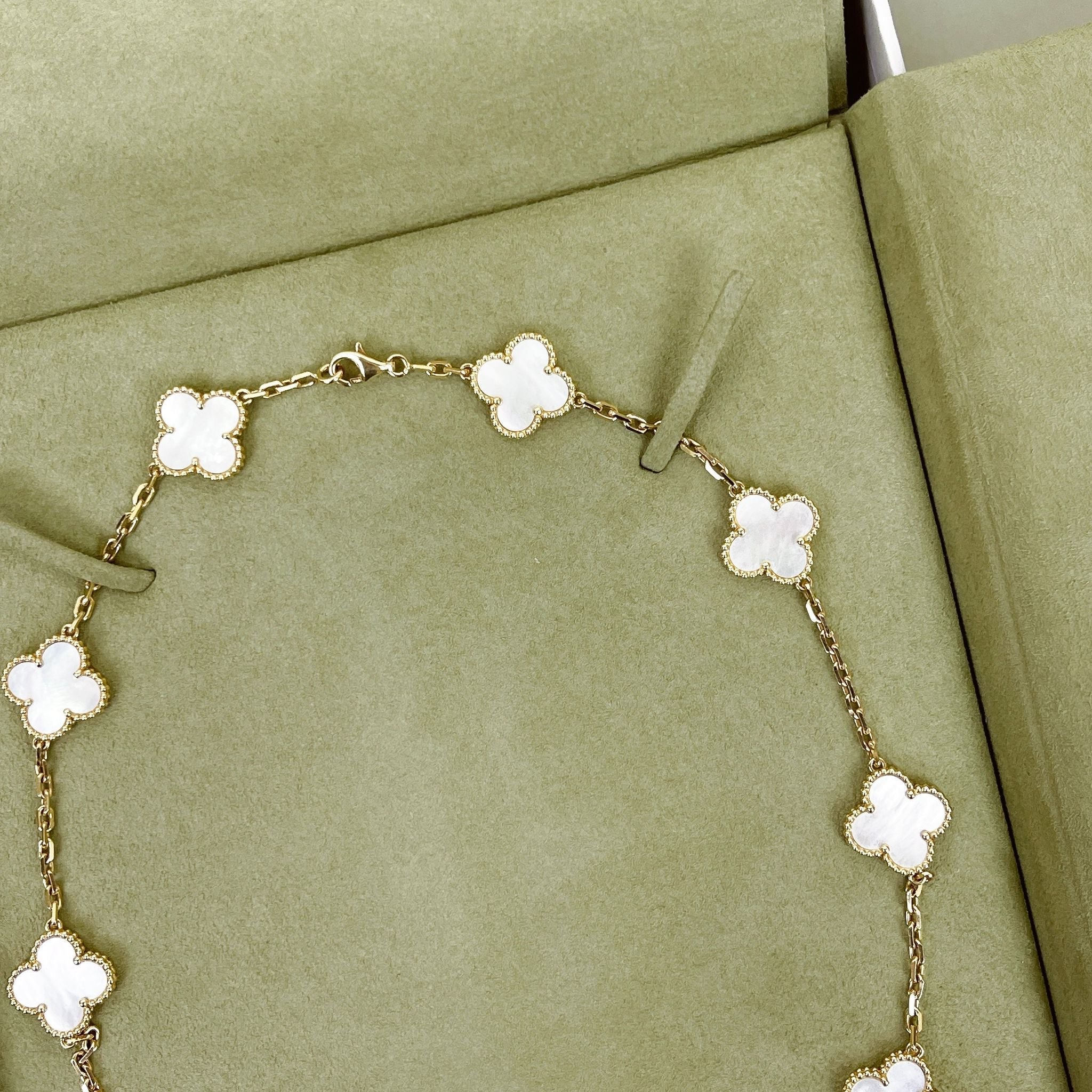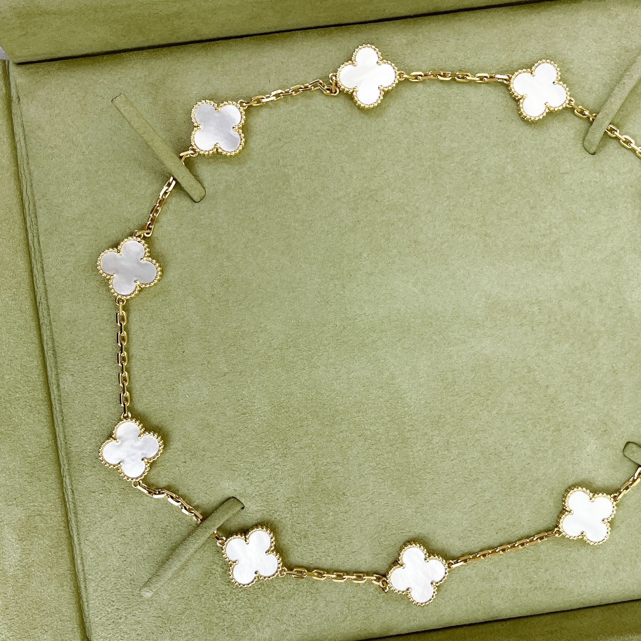 Van Cleef & Arpels (VCA) white mother of pearl 18k gold 10 motif vintage Alhambra necklace. Comes with box, certificate, receipt and Real authentication certificate.