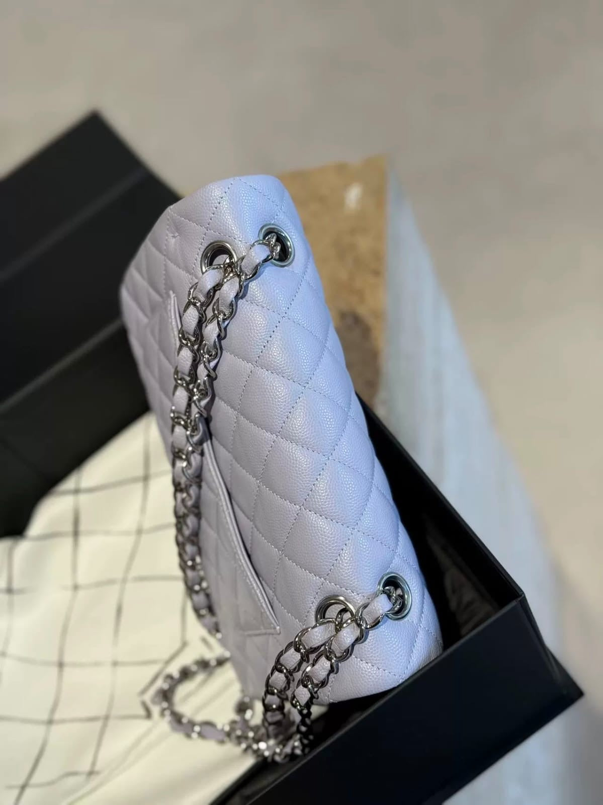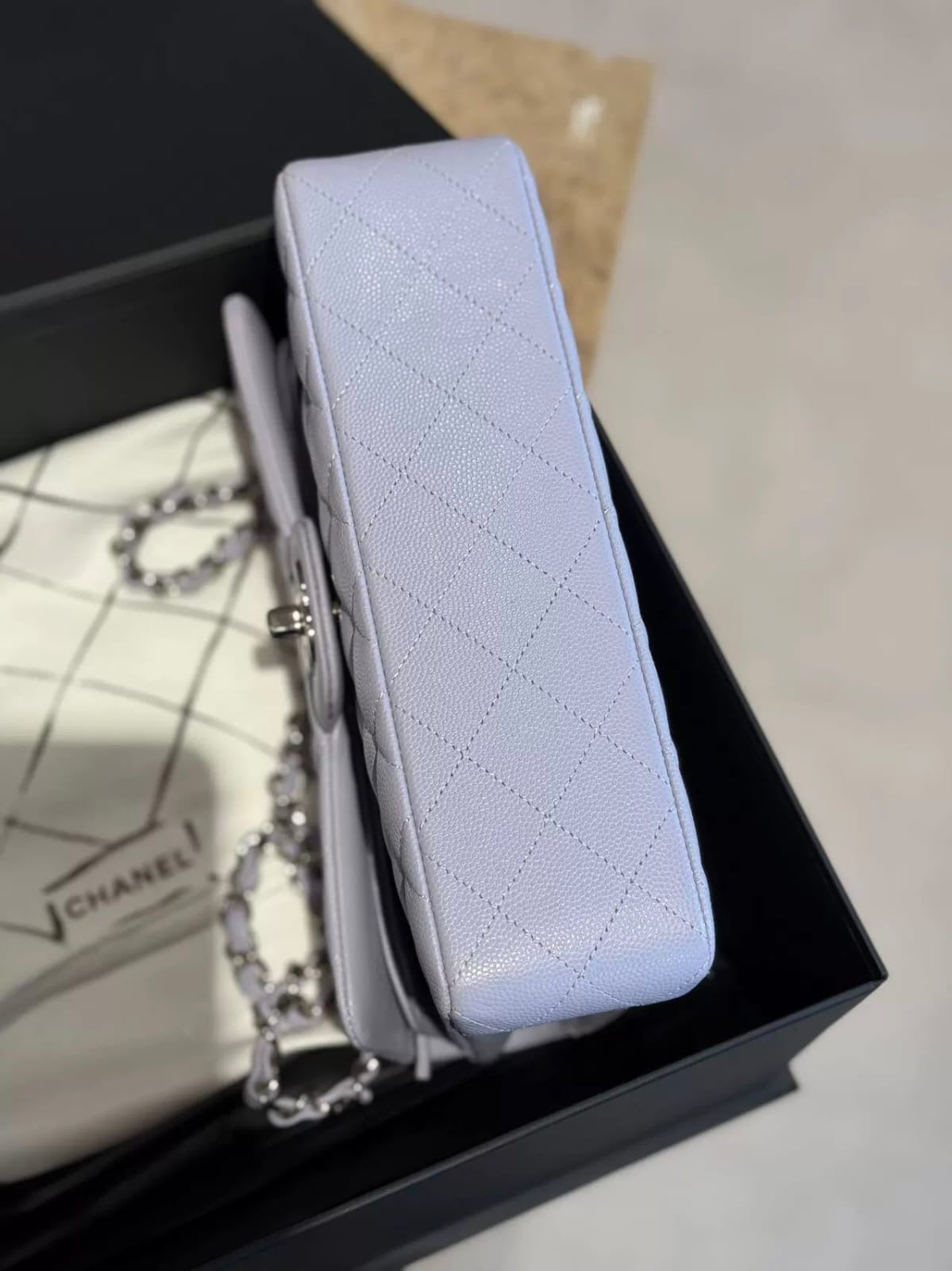 Chanel 21k purple lilac small classic flap caviar, silver hardware. Comes with box, dustbag, chip and certificate of authenticity