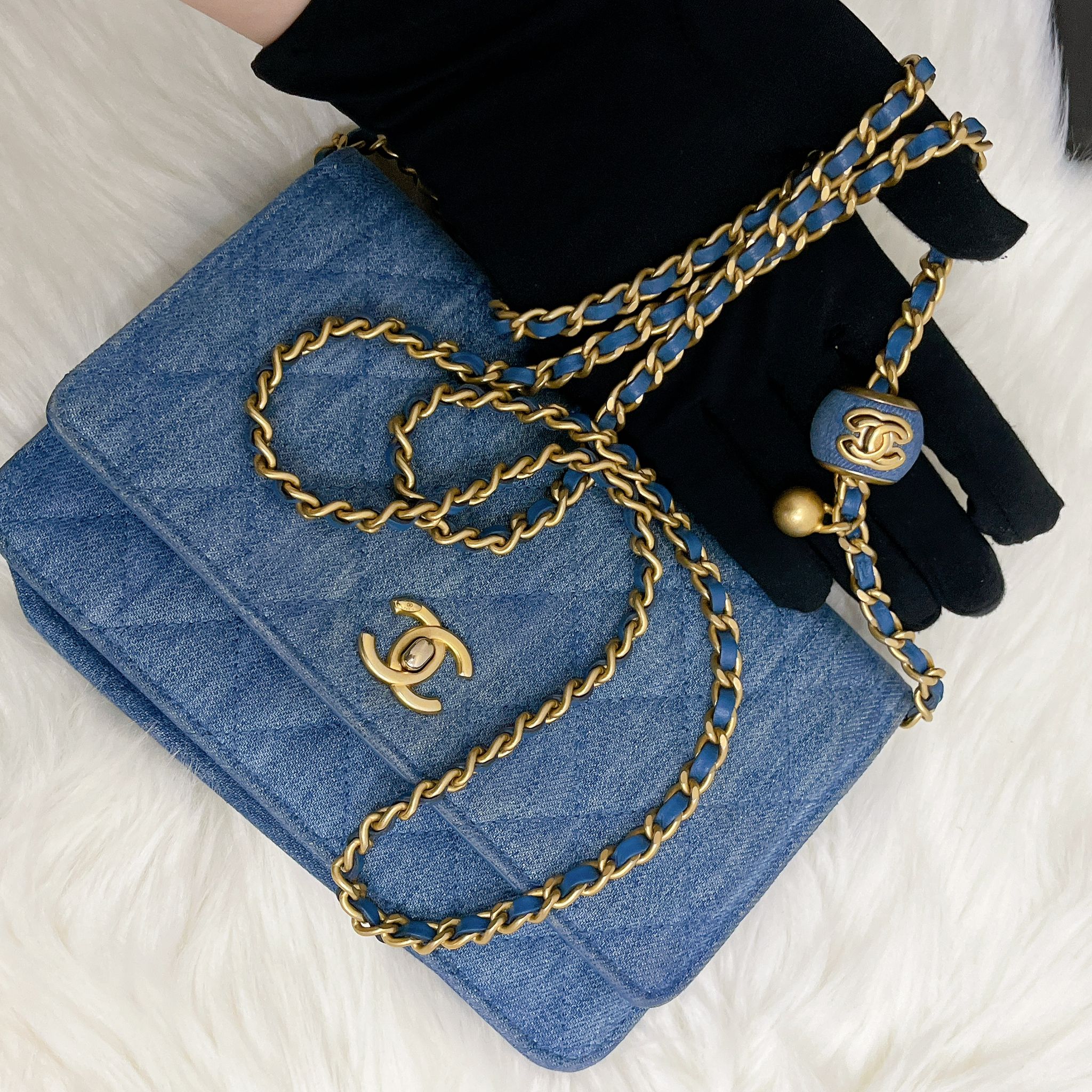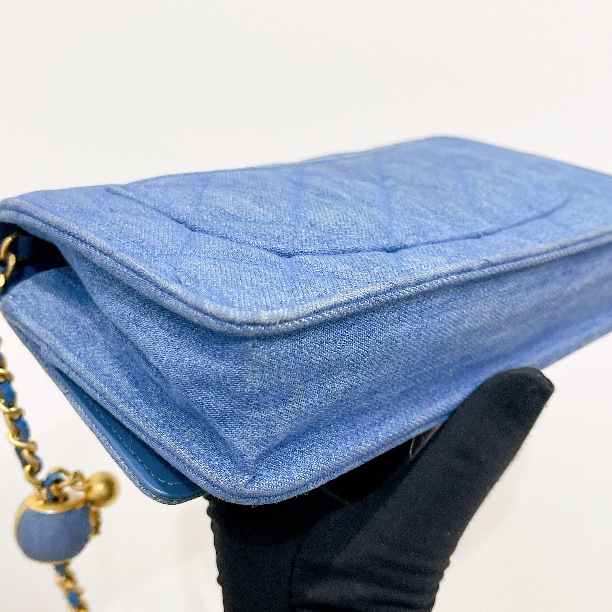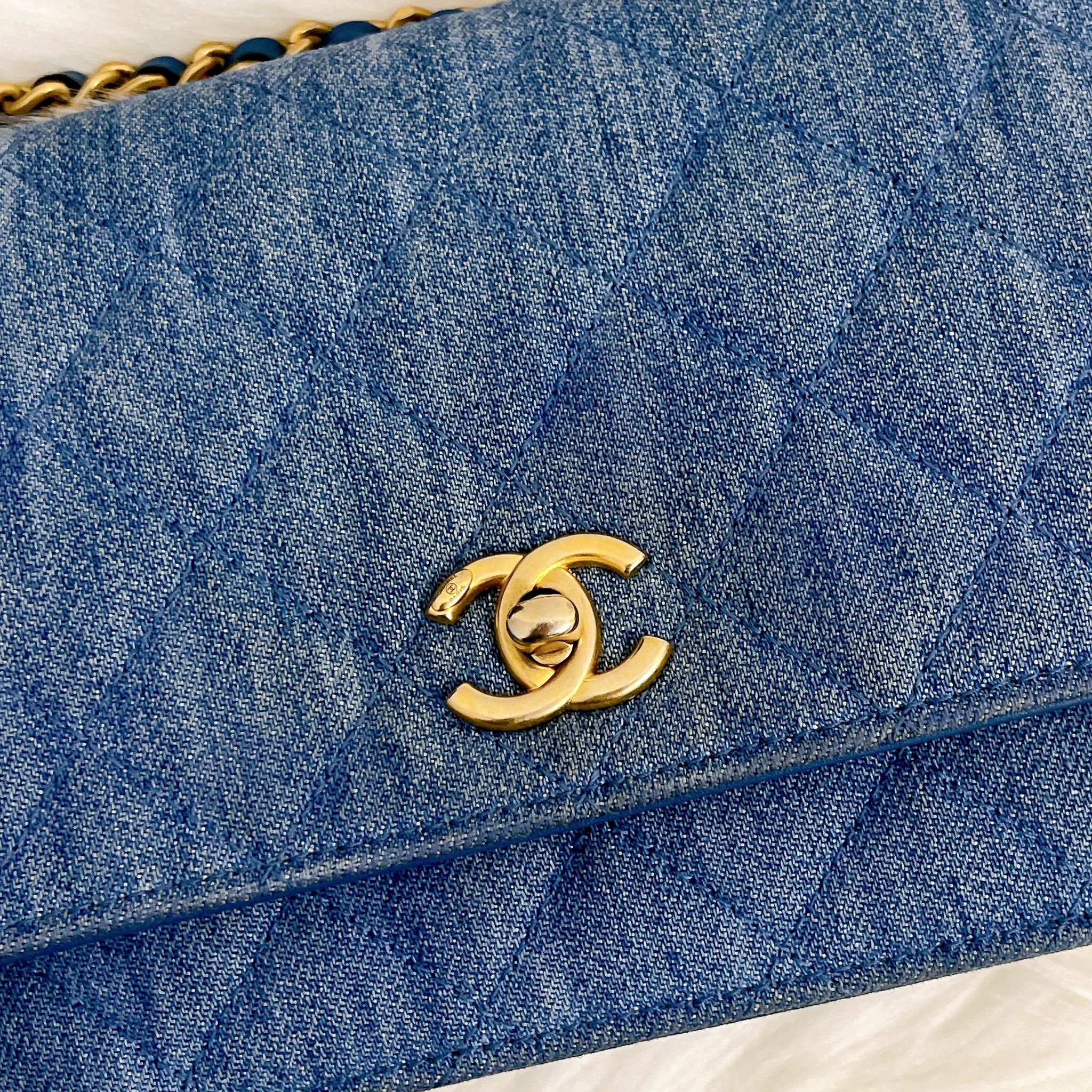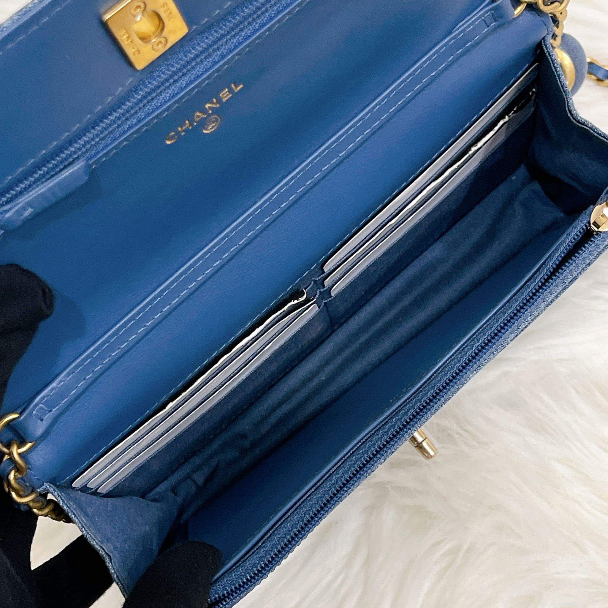 Chanel pearl crush denim wallet on chain (WOC), gold hdw. Comes with box, dustbag, chip and entrupy certificate.