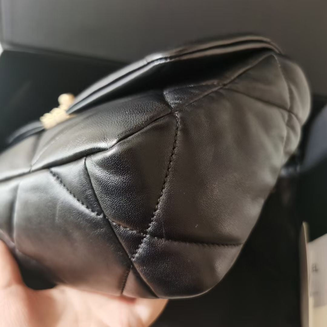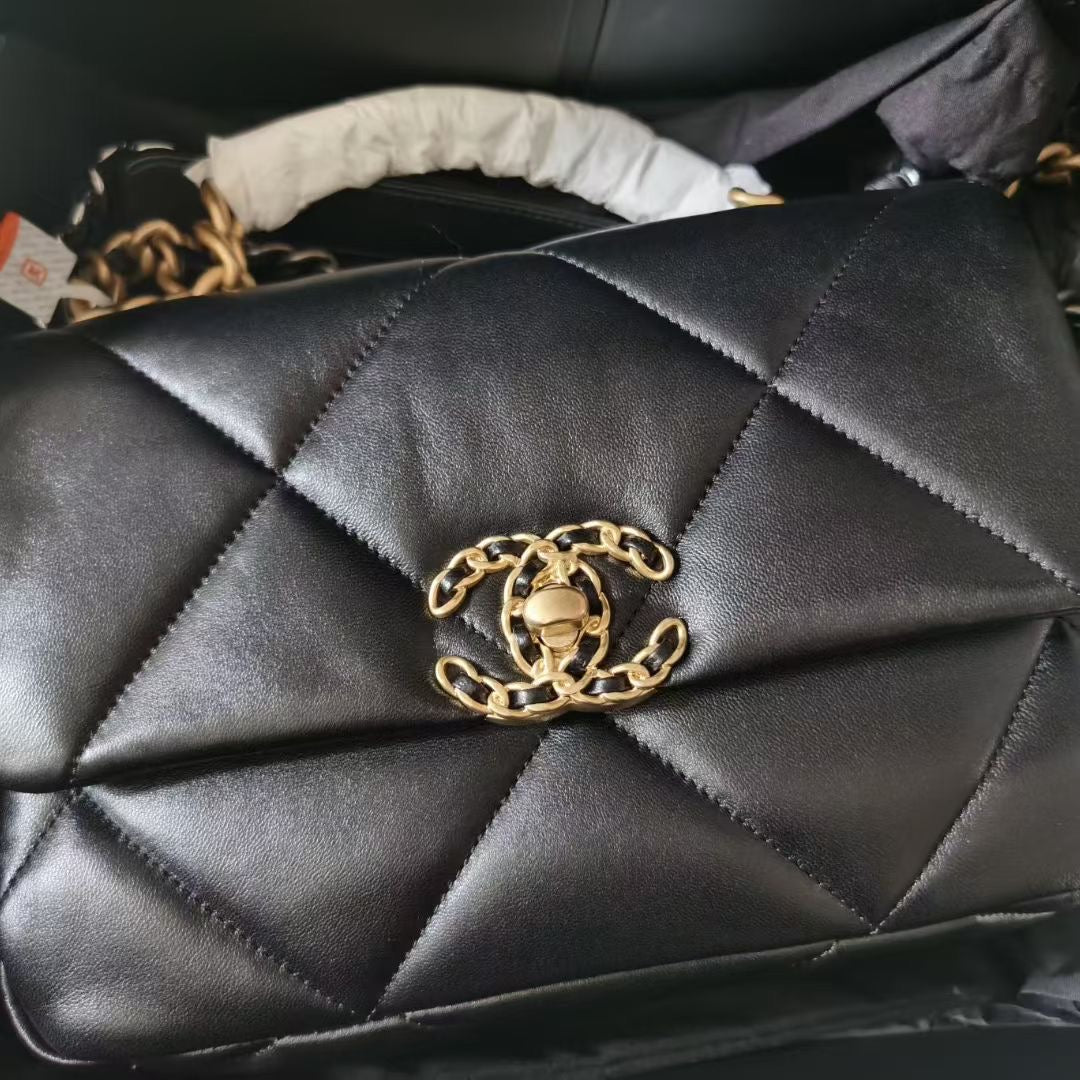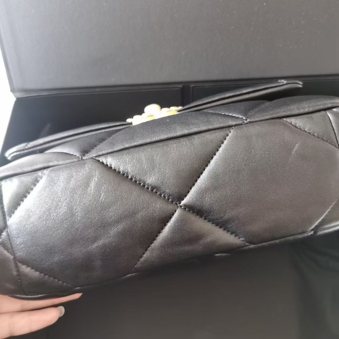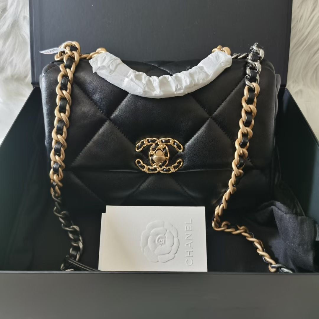 Chanel small black lambskin 19, with mixed gold hdw. Comes with box, dustbag, chip and entrupy certificate